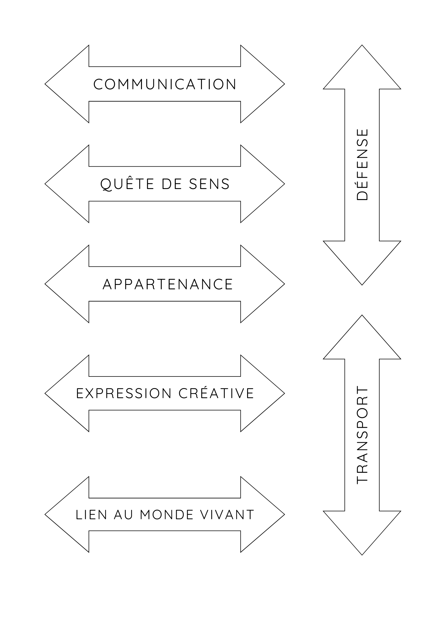 Les flèches des besoins fondamentaux aident l’enfant à identifier les aspects essentiels auxquels une civilisation a répondu, afin de mieux comprendre son mode de vie. Elles offrent une structure pour aborder les apprentissages en mettant en lumière les différents domaines qui composent la vie d’un peuple : habitat, alimentation, expression créative, lien au monde vivant, etc.