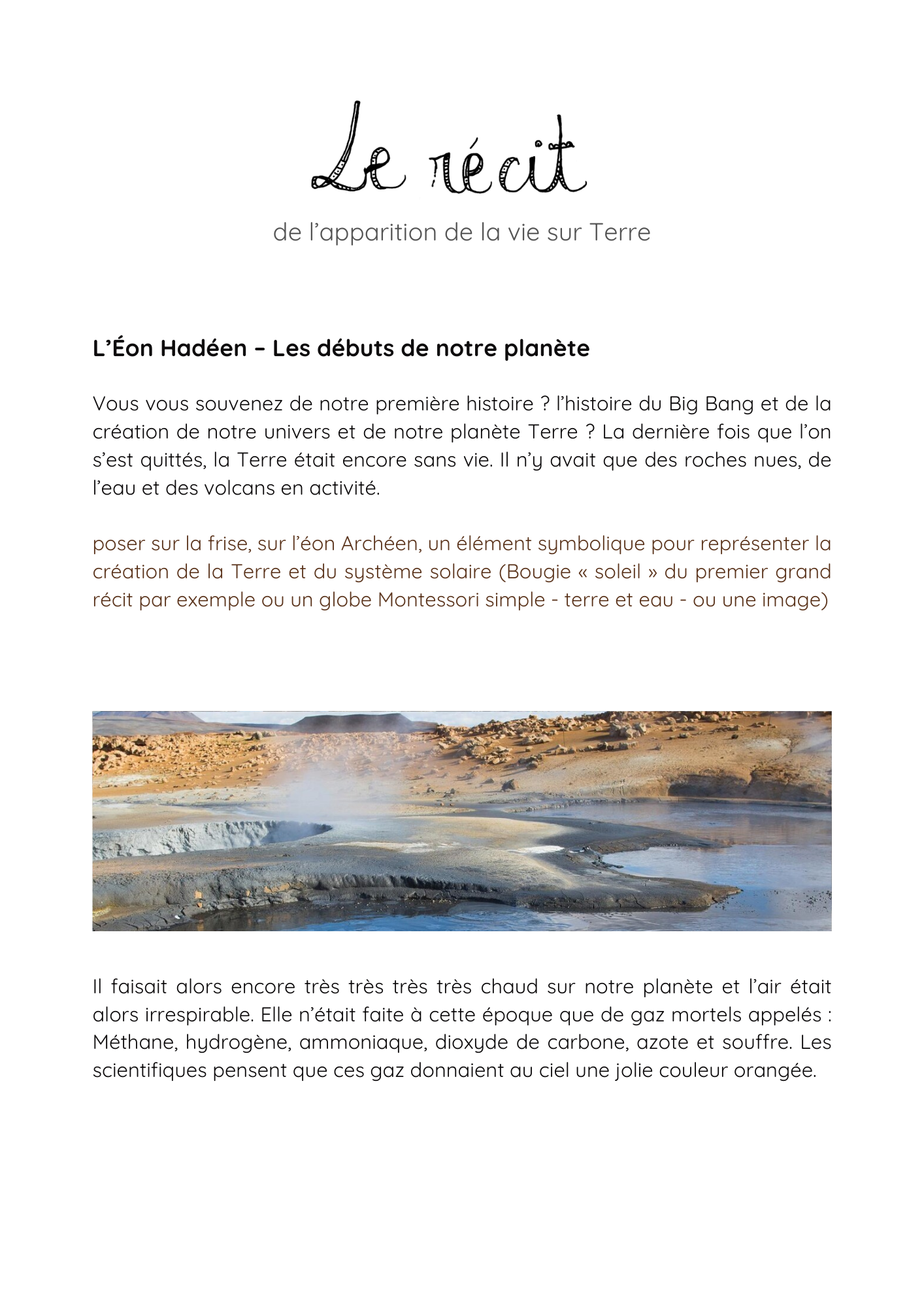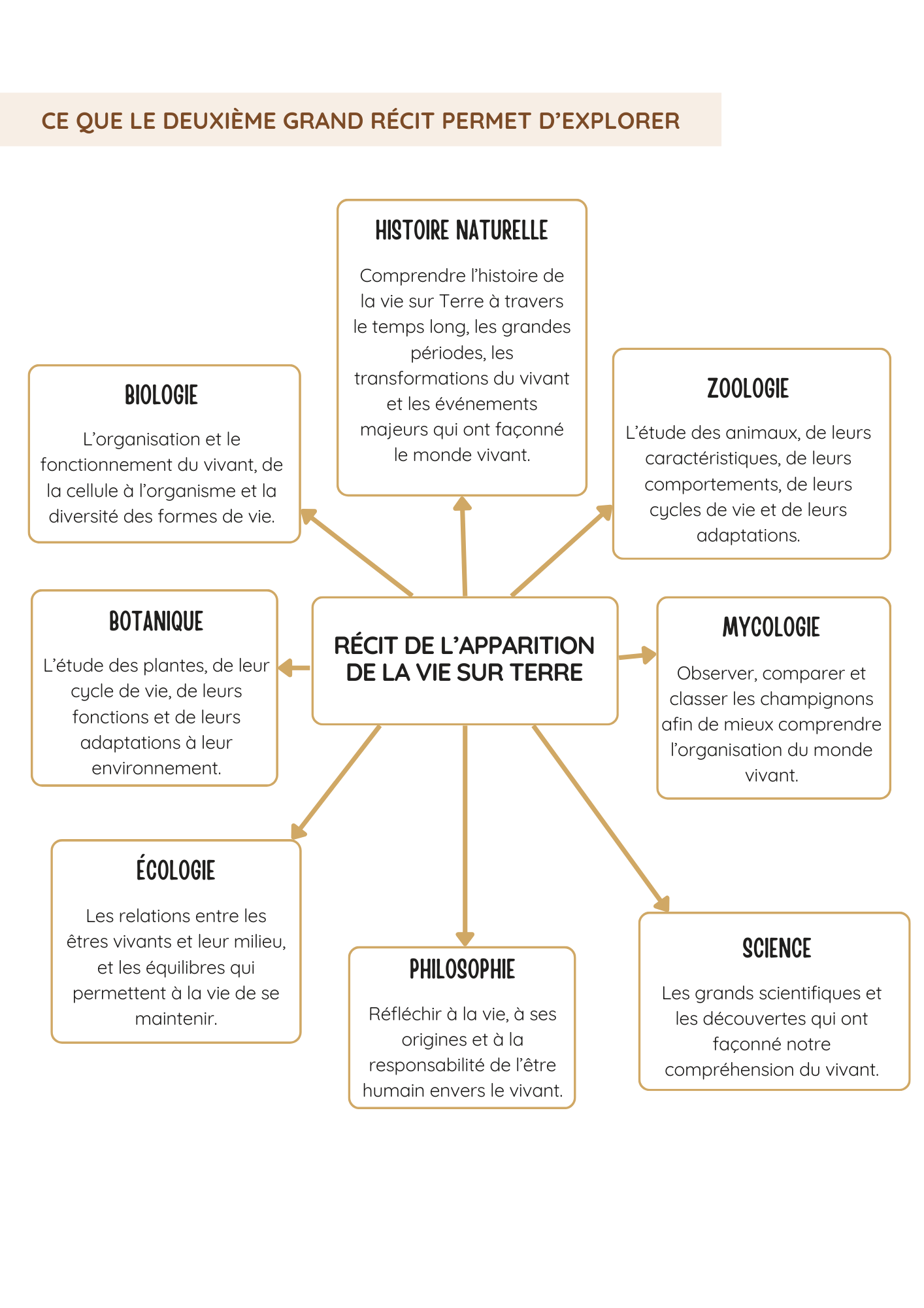 Le deuxième grand récit Montessori raconte l’apparition de la vie sur Terre. Il entraîne l’enfant dans une épopée extraordinaire, depuis les océans primitifs jusqu’à la merveilleuse diversité des êtres vivants. À travers une narration vivante et imagée, il découvre les premières cellules, l’évolution des formes de vie, l’émergence des plantes, des animaux et des écosystèmes. Ce récit met en lumière les transformations spectaculaires qui ont façonné notre planète et semé les germes de la vie telle que nous la connaissons aujourd’hui. Il éveille chez l’enfant la curiosité scientifique, le sens de l’observation et le respect du vivant. C’est une invitation à s’émerveiller devant la richesse du monde naturel, à questionner les mystères de l’évolution et à prendre conscience de l’incroyable histoire dont nous faisons partie. Ainsi, après avoir voyagé à travers le récit de l’apparition de la vie, l’enfant est naturellement conduit à explorer plus en profondeur la biologie, la paléontologie, la botanique, la zoologie et bien d’autres domaines. Ces disciplines lui offrent les clés pour mieux comprendre la vie sur Terre et nourrir sa soif d’apprendre.