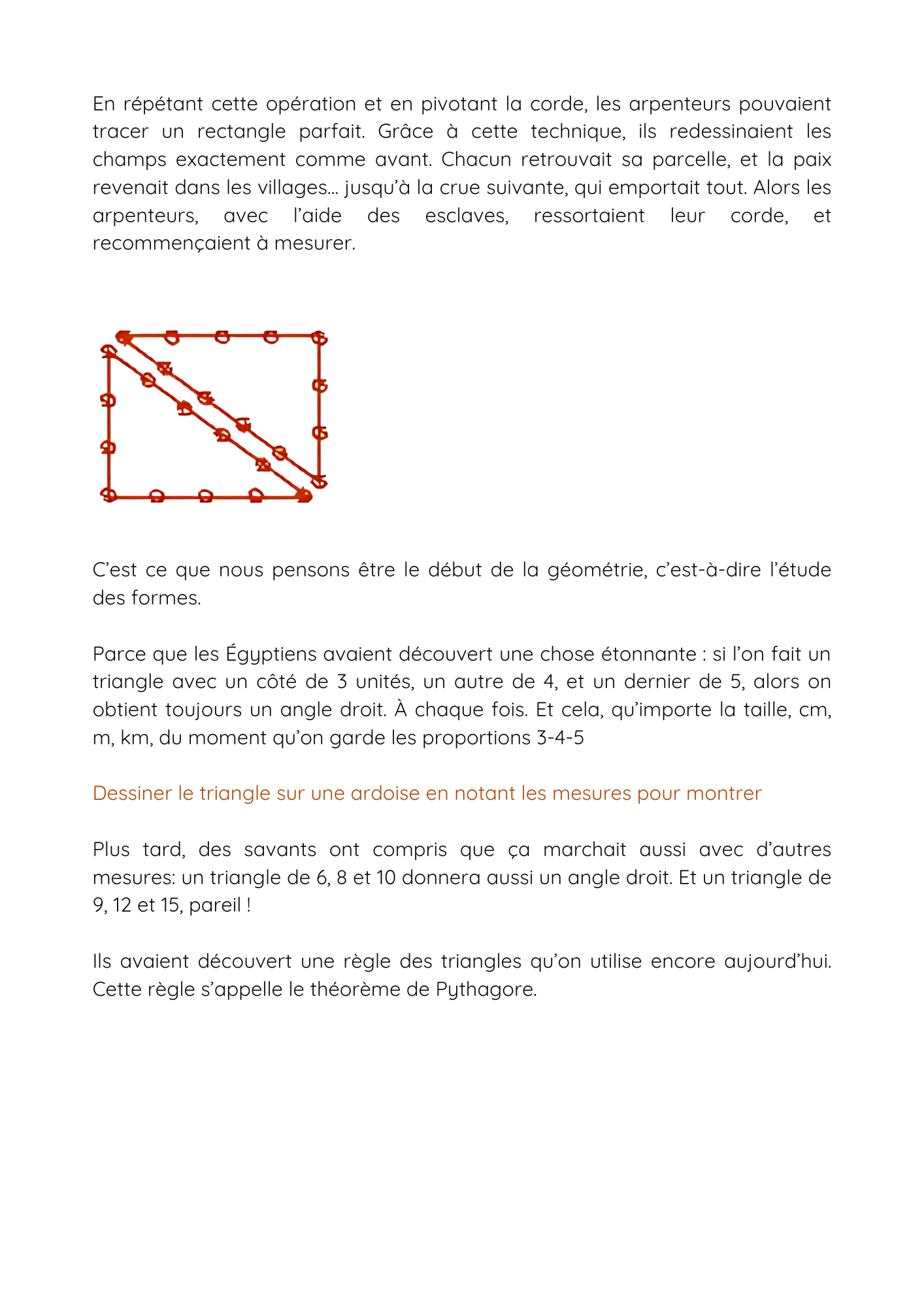 Ce récit est conçu pour précéder l’étude formelle de la géométrie. Il ouvre la porte à cette nouvelle discipline en lui donnant du sens, en l’ancrant dans une réalité humaine et historique : celle du besoin de mesurer, de partager, d’organiser l’espace, notamment après les crues du Nil, qui redessinaient chaque année les terres cultivables d’Égypte.